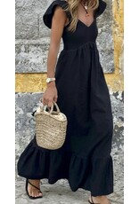Black V Neck Flutter Sleeve Smocked Bodice High Waist Ruffle Maxi Dress