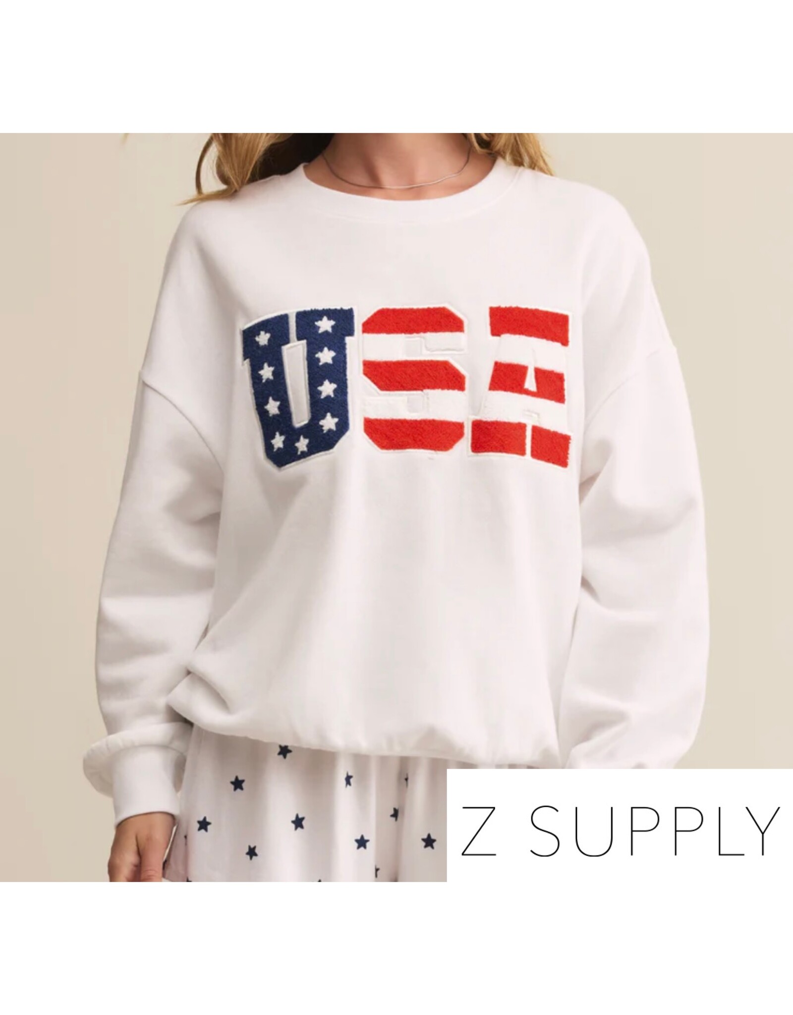 Cozy up in this oversized fleece sweatshirt featuring a bold stars and stripes “USA” boucle across the front. With a classic crew neckline and that perfectly roomy fit, it’s the kind of layer you’ll reach for whenever comfort calls.